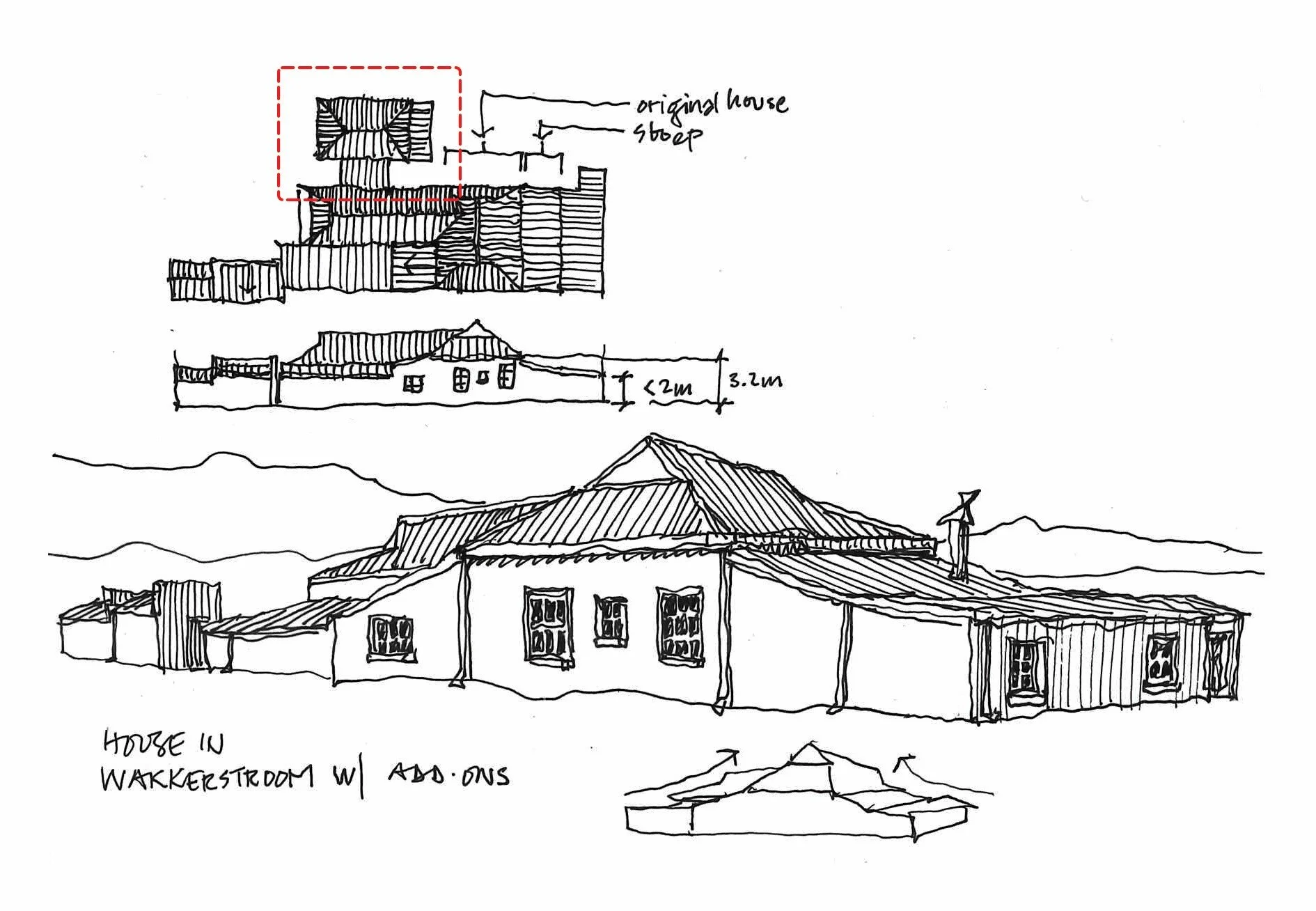 This sketch is of a house in rural South Africa, that has grown over time. It looks like a little hill, echoing the mountains in the background. I love this kind of unselfconscious architecture and I am sure it’s very cozy inside. But when you need to switch on the lights during the day and half your house is illegal because the ceilings are too low the charm might wear off. I noticed a part of the house, probably the garage (highlighted in sketch) is linked to the house with a small roof. This approach allows for better light and ceiling heights and reminds me of what my first year design lecturer once said: “Sometimes it’s easier to join something by separating it”.