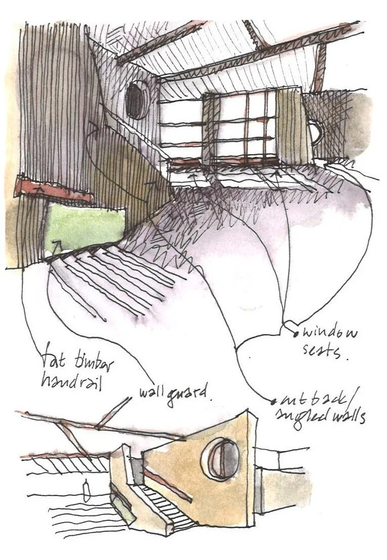 The above sketch is of Beansch House, which fans out and steps down the site to make the most of a beautiful setting. I love the big built-in sofa that is hidden from view upon entry.